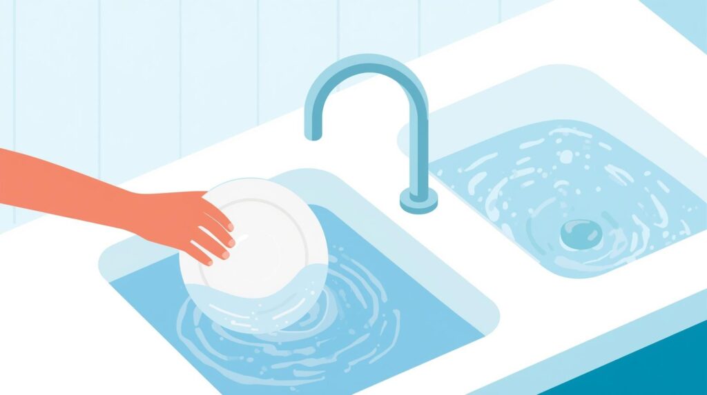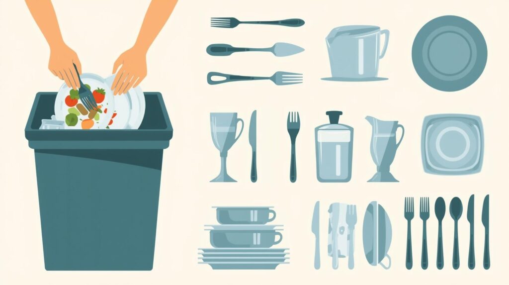 Scrape leftover food into the trash or compost. Sort dishes by type—glasses, utensils, plates, and cookware—to wash in order from cleanest to dirtiest.