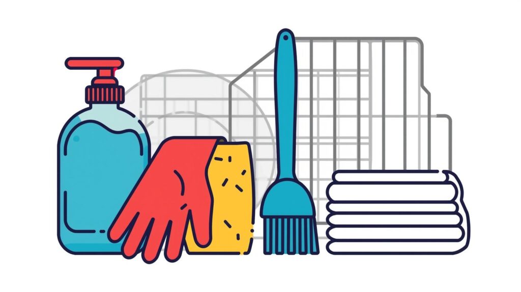Collect dish soap, a sponge or scrub brush, a drying rack, and clean towels. Use rubber gloves if preferred to protect hands from hot water.