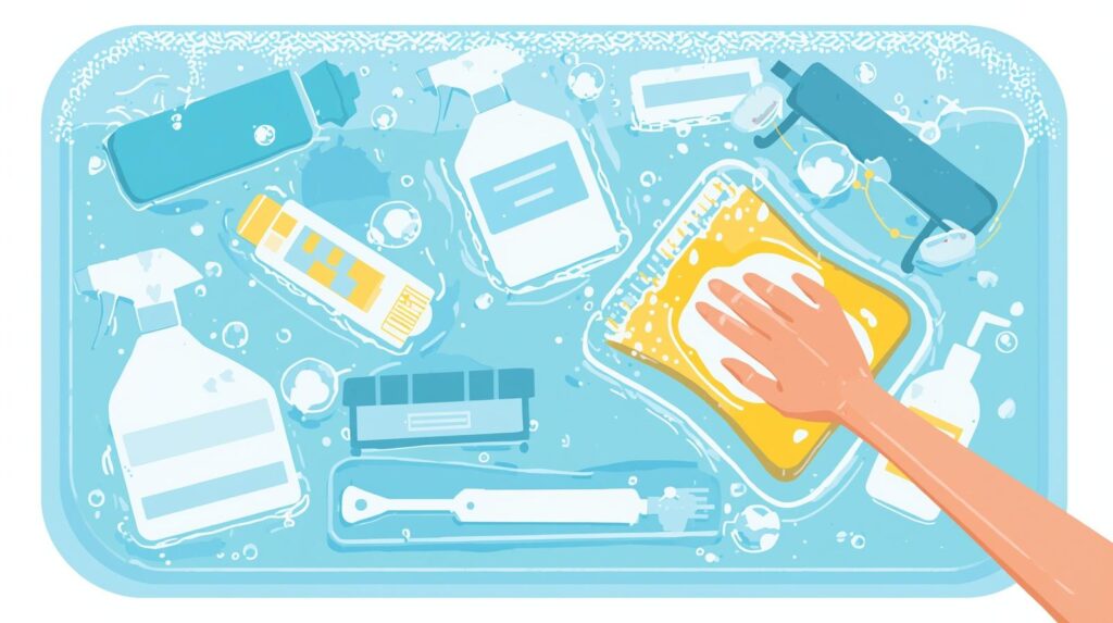 Submerge each item in soapy water. Use the sponge or brush to scrub away grease and residue. Pay extra attention to corners and edges.